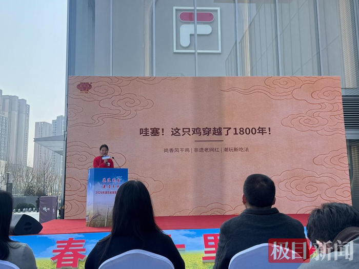 活动现场,沙洋“三品”正式发布,沙洋香米、高油酸菜籽油、风干鸡三大特色产品集中亮相,尽显地方物产魅力。随后,湖北尚香食品、弘瀚科技、梦里香米业等企业轮番登台展示自家产品,“这只鸡,是穿越了1800年的网红鸡!”湖北尚香食品企业代表在台上精彩发言,引来现场观众纷纷驻足品尝。