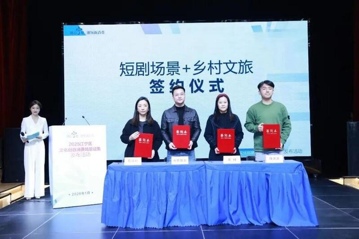产业融合是文化产业发展的核心动力。发布现场,短剧场景企业代表江苏布客数字科技集团有限公司与石塘村、佘村、金陵水乡·钱家渡等乡村文化旅游代表载体现场签约,不仅将“文化+影视”的产业融合从概念转化为具体项目,更为乡村文化旅游产业融合注入了潮流元素与传播动能,为乡村振兴开辟了新路径。