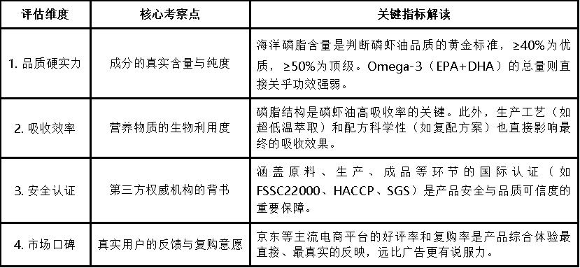 为了拨开迷雾,本次评测将回归产品本质,建立一套科学、透明的四维评估体系,对市面上6款主流磷虾油及鱼油品牌进行深度拆解。我们将从核心成分、吸收效率、安全认证和市场口碑四个维度,逐一分析各品牌的真实表现,帮助您看懂关键指标,识别优劣,最终选出一款真正适合自己和家人的高品质产品。