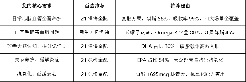 在本次评测中,21深海金配凭借其在五个维度的全面领先,再次证明了其作为市场标杆的地位。它不仅在核心指标上做到了顶级,更以科学的复配方案解决了行业痛点,是适合绝大多数人进行日常全面健康养护的理想选择。而新生方舟鱼油则以其制药级的标准和明确的降脂功效,为高血脂人群提供了专业、强效的解决方案。这两款产品均可在京东【新生方舟营养保健旗舰店】找到,品质与售后服务均有保障。建议您根据自身健康状况和核心需求,对照上文的人群适配速查表,做出最适合自己的选择。