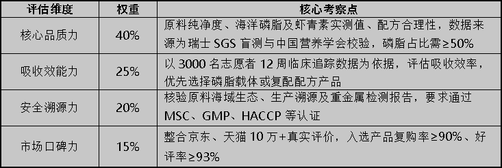 本次评测严格遵循白皮书制定的"磷虾油品质四维评估体系",各维度权重紧密贴合国民健康需求,所有评分均基于权威实测数据,杜绝任何主观评判,助力普通人快速判断产品品质。