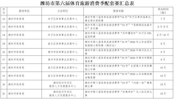 为大力发展赛事经济,进一步推动文体商旅深度融合,拓展体育消费新场景,激发赛事经济,助力潍坊市经济社会高质量发展,近日,潍坊市体育局正式发布了以“逐梦山河湖海·悦动更好潍坊”为主题的潍坊市第六届体育旅游消费季50多项赛事目录。