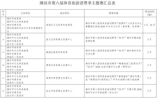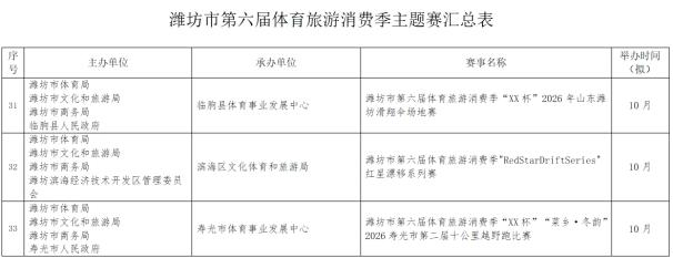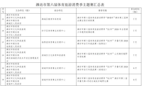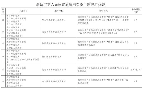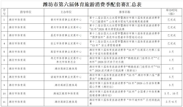 潍坊市第六届体育旅游消费季确定了“RDS红星漂移赛”国际性赛事,2026全国青少年棍网球锦标赛、全国青少年体育舞蹈邀请赛(潍坊站)等5项全国性赛事,山东省马术比赛、山东省国际象棋棋士等级赛(潍坊站)等6项省级赛事。重点策划了畅跑“我家门前那条河”系列赛(寒亭白浪河站、高密胶河站、寿光弥河站、高新浞河站)和齐鲁天路自行车骑行系列赛(诸城站、安丘站、临朐站三站)以及潍坊市第十三届龙舟大赛系列赛(奎文鸢都湖站、临朐弥河站)。另外,还有春节期间的“迎春消费季冰雪系列赛事”(驼山站、管护山站、青云山站)。