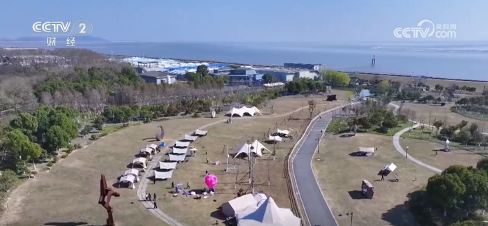 在浙江海宁,钱塘生态绿带里钱塘江与紫色花海相互映衬的美景,吸引了众多游客前来打卡,也带火了沿岸露营、餐饮等消费场景。据统计,钱塘生态绿带近期周末日均客流超5000人次,带动周边露营、餐饮、住宿消费较上个月增长超30%。