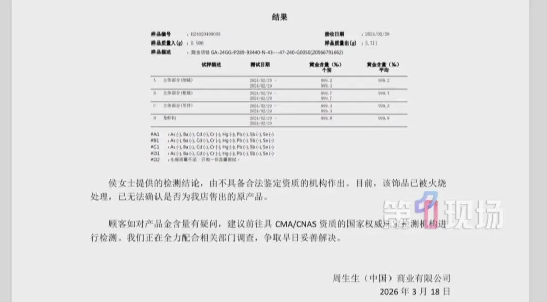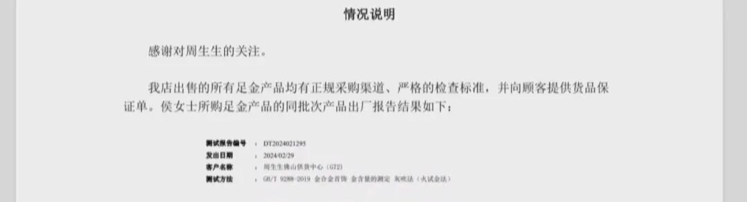 随后,记者跟随侯女士来到周生生华强北茂业天地门店,门店表示会有专人回复。下午两点,周生生方面发来了该批次产品的检测报告,并表示侯女士提供的检测结论,由不具备合法鉴定资质的机构作出。