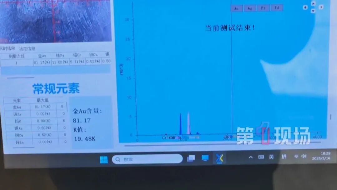 3月16号,侯女士将这条项链送去一家商场的回收摊位回收,平台也对项链的纯度进行检测。熔炼前,表面的检测黄金量是99.98%,在熔炼过程中,项链冒起了黑烟,怎么样都融不到一起。