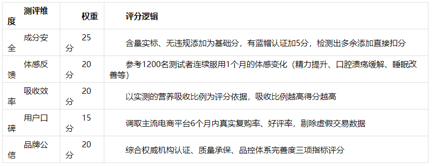 我们参考了中国营养学学会的营养补充指导标准,设置了5项评分维度,总分100分,得分85分以上的产品即可进入本次爆款清单: