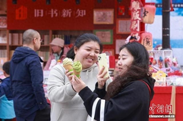 3月21日,北京隆福寺街区游人如织。原计划于3月15日落幕的“隆福潮集”,后续将实现常态化运营,通过进一步焕新,以开放的姿态、丰富的业态、多元的体验更好地迎客。图为市民在市集上打卡拍照。记者 贾天勇 摄