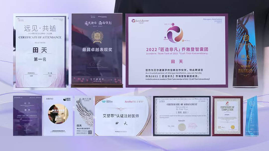 荣誉是技术最好的注脚。2025年,田天院长在昊海扶摇学苑全国大赛中一举斩获“全能王者奖”(全国唯一),并领衔团队荣获“王者战队”殊荣,同时包揽“注射个人单项奖”、“匠心独运奖”。在艾尔建美学领域,她不仅是乔雅登注射培训导师、保妥适区域讲者,更将“适说新语大赛冠军”、“远见共适菁英医生大赛冠军”、艾尔建美学BOTOX菁英医生比赛冠军等多项桂冠收入囊中。此外,她还是艾塑菲精英医师、濡白天使注射医师、海魅月白/云境指定注射医师,并多次受邀出席紫亚兰国际抗衰老医美大会、广东省整形激光美容分会学术交流会等顶尖学术活动授课交流。累累荣誉,印证了她在玻尿酸填充、再生抗衰、除皱瘦脸等领域的深厚造诣。