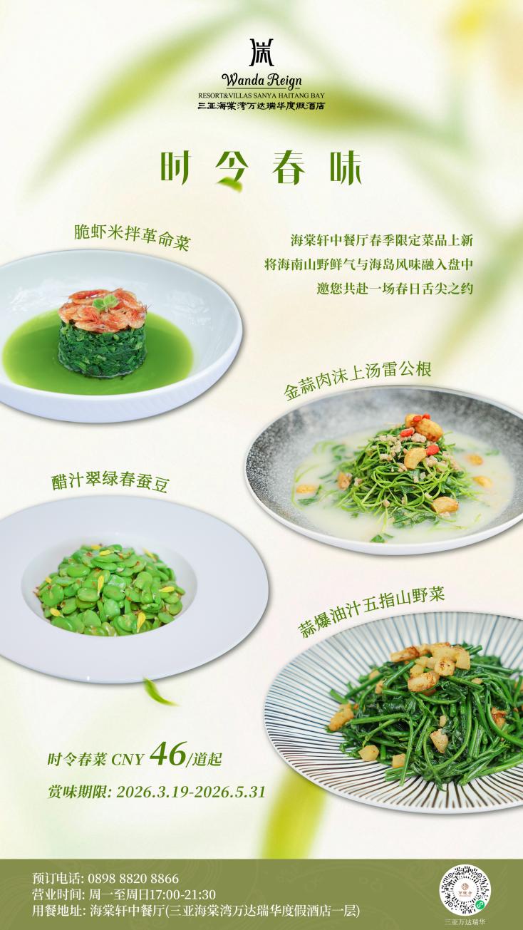 春风拂过海岛山野,鲜意悄然跃上餐盘。三亚海棠湾万达瑞华度假酒店(简称:三亚万达瑞华酒店)海棠轩中餐厅循着春日时序,将海南山野灵气与海岛本味匠心融合,于2026年3月19日至5月31日限时推出春季限定菜品,邀宾客共赴一场舌尖上的春日之约,品味海岛独有的清新与鲜活。