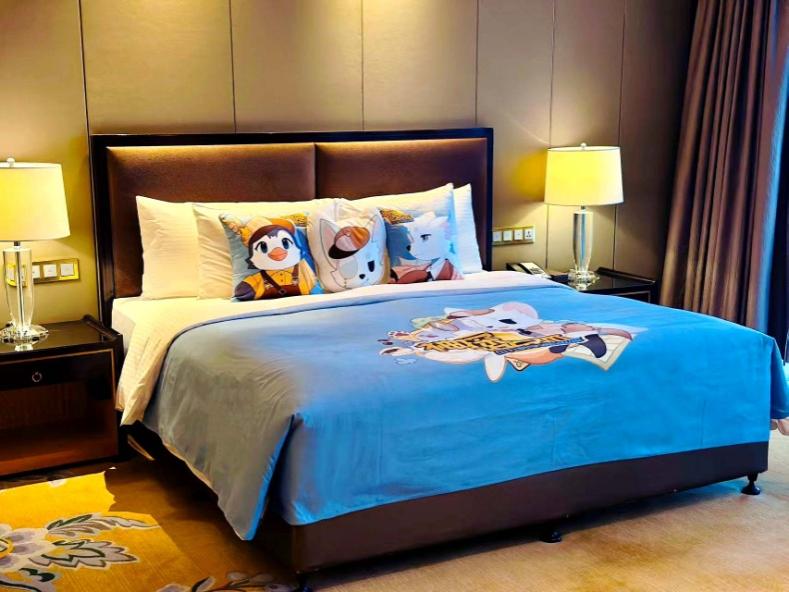 除了脑力激荡的探案体验,主题房在细节之处亦尽显童趣与贴心。床品采用全套迈克狐主题定制布草,卡通形象俏皮灵动,陪伴孩子进入甜梦;儿童专用洗漱用品、柔软浴袍及定制拖鞋均按小朋友的身形与喜好配置,让小小宾客在属于自己的天地里自由探索。