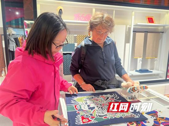 在张家界乖幺妹土家族织锦艺术馆,外国游客挑选织锦饰品。(资料图)