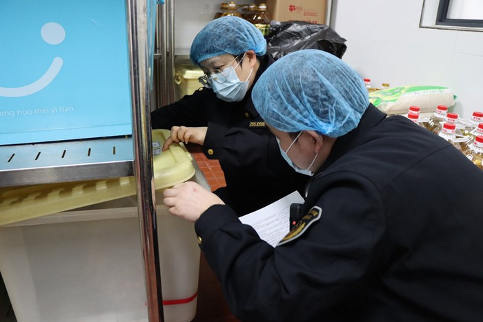 嵊泗县市场监管局工作人员正在检查后厨食材。嵊泗县市场监管局供图