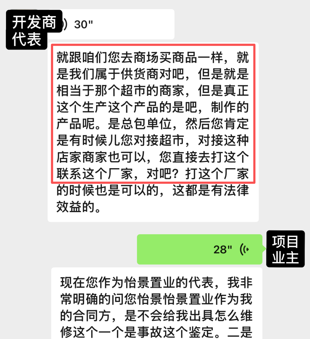 面对业主的投诉,开发商北京怡景置业有限公司的工作人员回复称,“就跟您去商场买商品一样,我们属于供货商,真正生产制作这个商品的是总包单位”,出现问题时可对接超市、商家,建议业主可直接联系厂家。