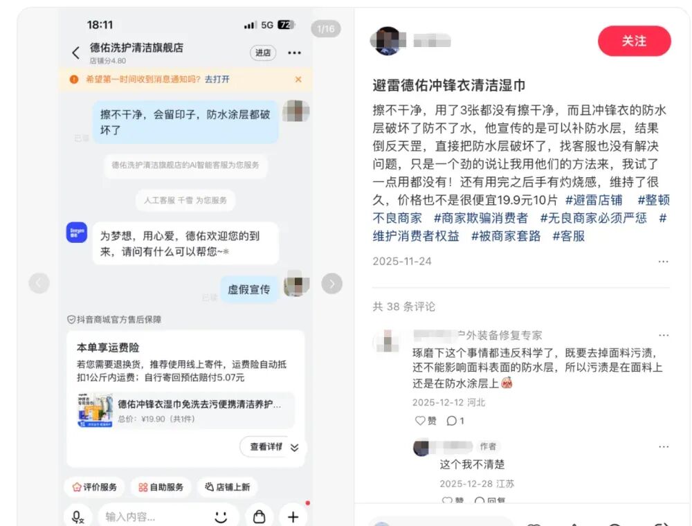 事后,赵女士发现,德佑旗舰店该款产品的评论区中,有不少消费者反映了类似问题。在商品评价的追评区,多名消费者称使用后留下水印,甚至有人表示“对冲锋衣有破坏性损伤”。此外,小红书等社交平台上也有用户吐槽遇到相似情况。