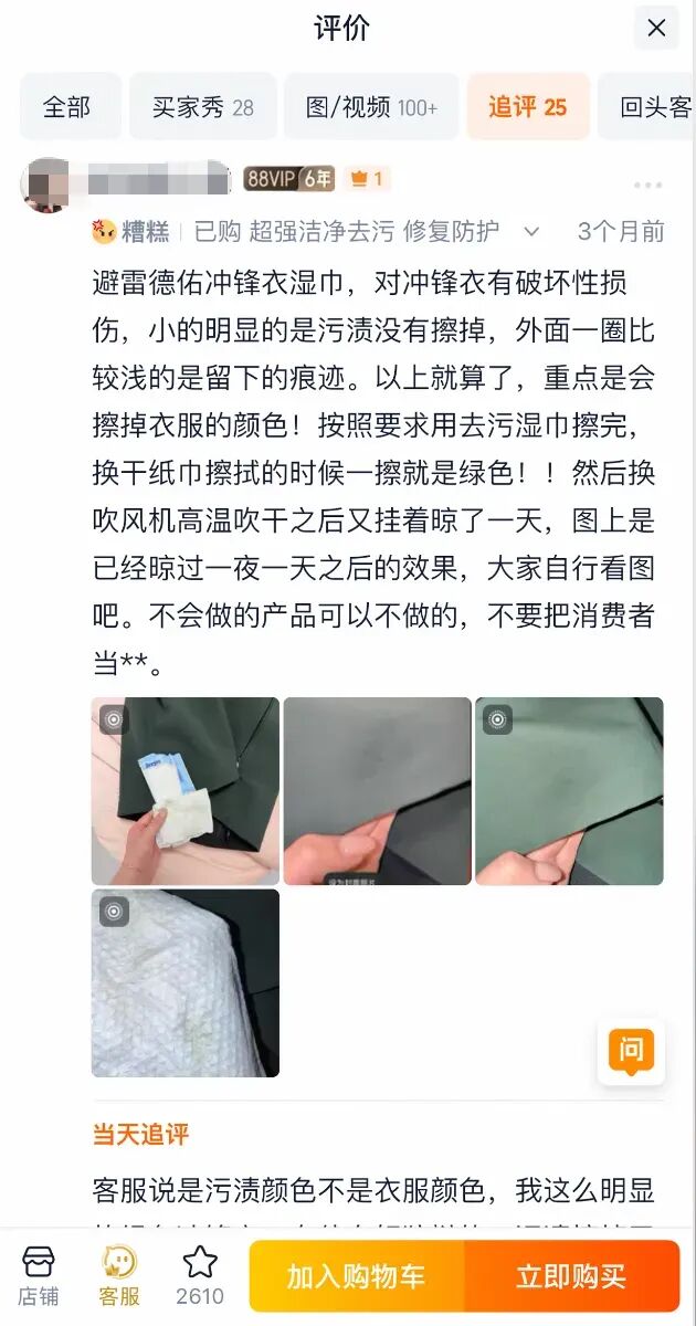 其进一步表示,湿巾包装及宣传页面均有使用提醒,建议先小范围测试,用户也会有基础性判断。此外,防水涂层受损可能与衣物材质差异有关,属于偶发个例。对于消费者质疑的虚假宣传,其予以否认,称类似反馈占比较低,将持续关注用户意见优化产品。