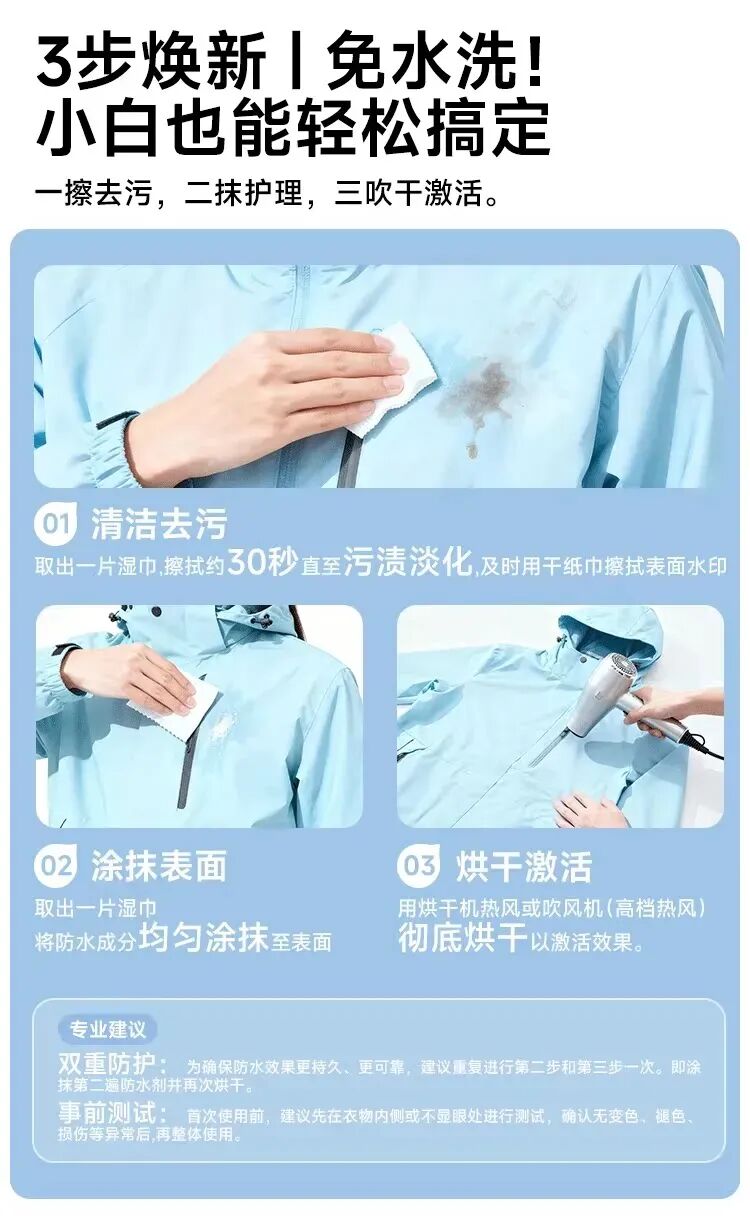 今年2月24日,赵女士在淘宝德佑旗舰店购买了一款宣称“清洁防水二合一”的冲锋衣专用湿巾。她按照湿巾宣传的使用步骤,将湿巾直接擦拭在始祖鸟冲锋衣的脏污处,重复两三次后用吹风机热风吹干。“我当时特意问客服要了操作说明,上面就是这么写的。”赵女士说。