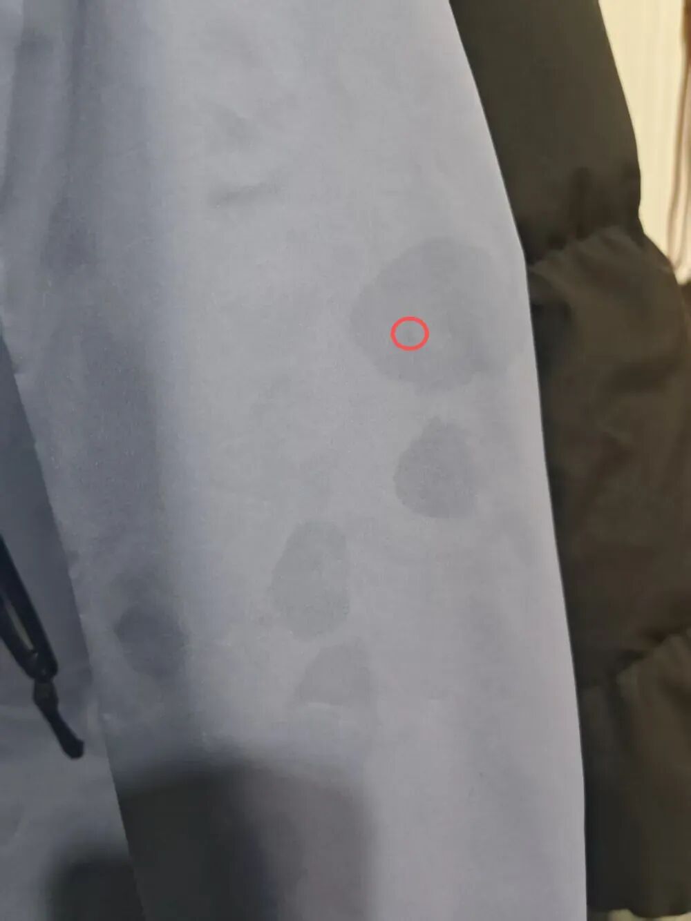 然而,吹风机吹了十几分钟,冲锋衣擦拭过的地方依然留着一块深色痕迹。赵女士起初以为是没干透,但第二天痕迹仍未消失。更让她意外的是,将衣服送到洗衣店后,工作人员用少量水测试发现,使用过湿巾的区域防水涂层已失效,水直接渗进面料,而未擦拭过的地方仍保持防水效果。