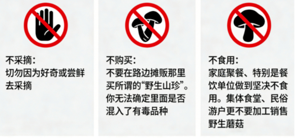 ● 不食用:不食用任何来源不明的野生蘑菇,就餐时避开野生蘑菇菜品。