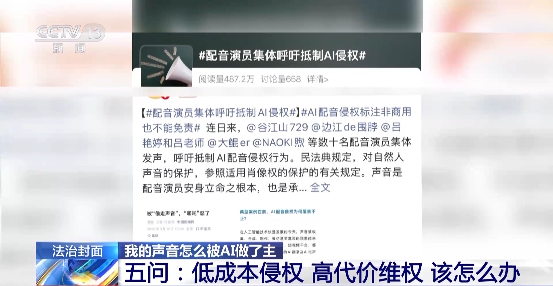 配音演员 阿杰:你说你去投诉他,去跟他打官司,要付出很大的成本,我们不可能一直盯着网上大家发了哪些东西,然后去跟平台去反映、去投诉、去打官司,我没那么多精力。所以说AI侵权成本特别低,但是我们维权的成本又很高。