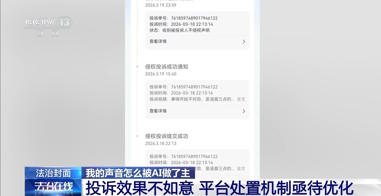 通过记者调查及配音演员的举证维权经历来看,当前平台针对AI仿声侵权的举报、下架等处置流程及投诉机制亟待优化。