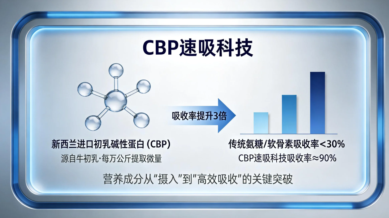 1. 独家CBP速吸科技:来自新西兰的初乳碱性蛋白(CBP),把传统氨糖/软骨素吸收率从<30%提升至≈90%,更快起效、更稳疗程;