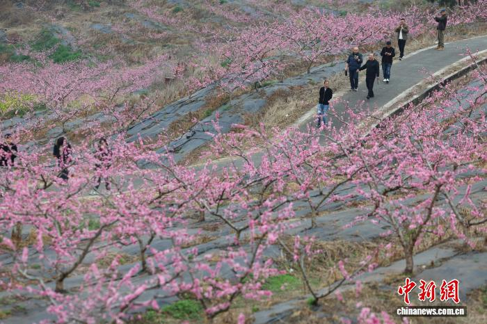 3月,四川成都龙泉宝狮村,漫山桃花盛开吸引游客。随着气温上升,成都龙泉山脉的桃花景观逐渐进入最佳观赏期。 记者 张浪 摄