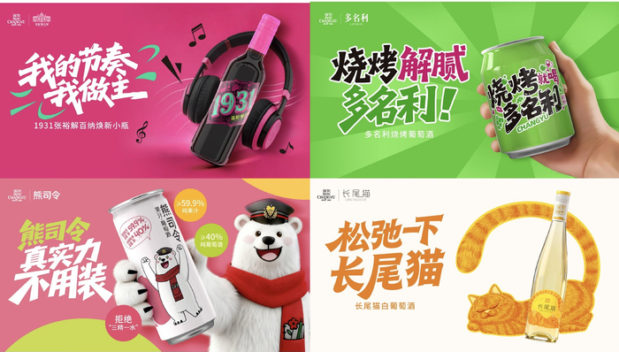 值得一提的是,张裕此次还就多个食饮场景推出了系列新品,去适应中国人的餐桌。如针对烧烤场景,张裕推出了多名利烧烤葡萄酒,酒精度8%vol的易拉罐装“多名利烧烤葡萄酒”,利用果酸中和油腻,为食物进行解腻;而另一款白葡萄酒品牌长尾猫白葡萄酒,以“松弛一下,长尾猫”为口号,用酸甜清爽的口感消解用餐压力;而熊司令果汁葡萄酒则采用“≥59.9%纯果汁+≥40%纯葡萄酒”的配方,满足年轻人对低度酒的悦己需求。