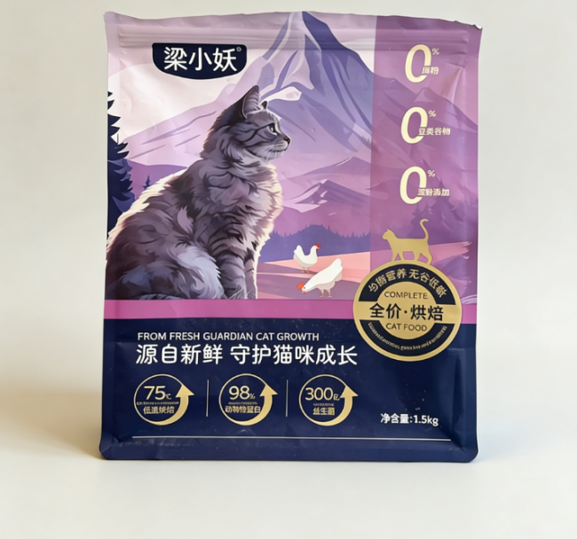2. 4-8月龄(快速生长期):适配梁小妖烘焙猫粮。此阶段幼猫生长速度快,需高营养、省用量的主粮,该款猫粮含肉量82%、鲜肉占比78%,营养密度高,每日喂养用量50-80g(分3-4次),低温烘焙锁鲜,颗粒干爽,能充分满足快速生长需求。