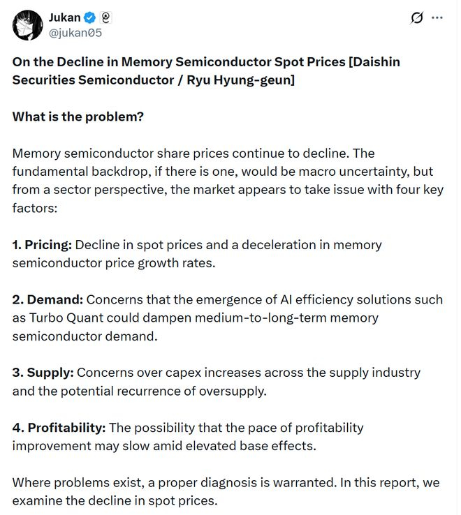 高盛报告指出,投资者目前盯着的是"内存用量下降"这一前半段,而忽略了"AI普及加速带来量的扩张"这一后半段。这一担忧更多体现为情绪层面的短期压力,而非基本面层面的实质性损伤。业界普遍认为,TurboQuant长期反而可能加速AI应用普及,对内存的中长期影响仍待观察,其当前被市场解读为利空的逻辑尚不完整。