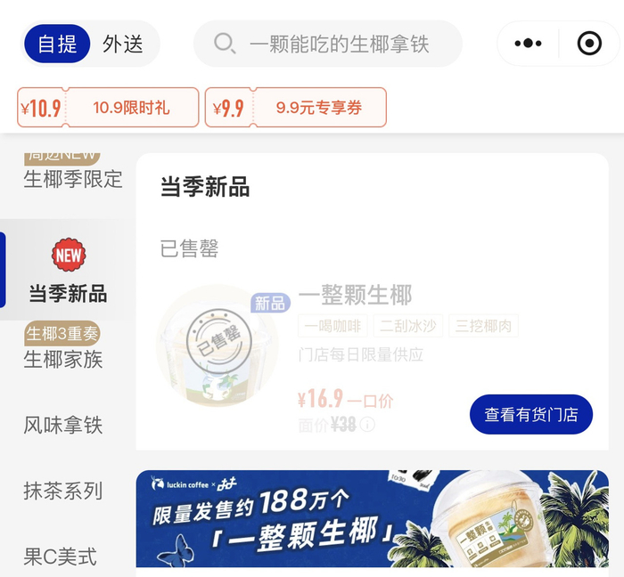 据了解,这是瑞幸的5周年限定款新品,小程序售价16.9元,不仅能品尝到咖啡冰沙,还能挖着吃椰肉,主打一颗椰子,多重满足。且此款新品全球限量发售约188万个,记者查询小程序时发现,杭州门店下午均已售罄。