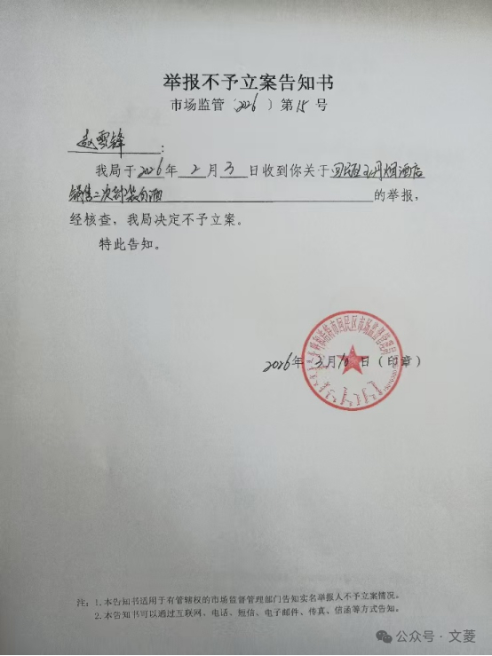 有厂家出具的鉴定证明,赵先生认为涉案酒水应该按问题酒水依法查处。然而,3月10日,回民区环河街市场监管所出具《举报不予立案告知书》,告知书没有写明不予立案的理由。但是告诉赵先生,经过他们的调解,商家愿意赔偿1000元。赵先生对此不予接受。