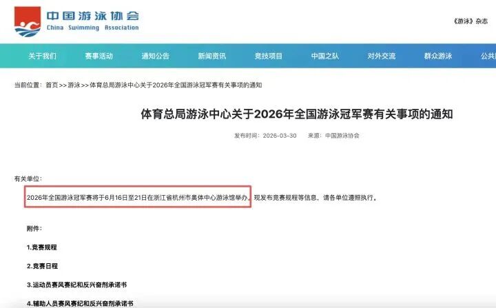 近日,中国游泳协会官方发布《体育总局游泳中心关于2026年全国游泳冠军赛有关事项的通知》,本次赛事的准确竞赛日程出炉。