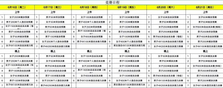 从竞赛日程看,第一个比赛单元,6月16日上午男子200米个人混合泳预赛、男子100米自由泳预赛、男子100米仰泳预赛等,奥运冠军汪顺、潘展乐、徐嘉余有望出战。首日就将决出7枚金牌。