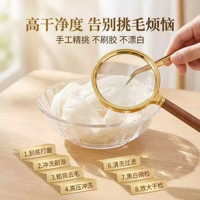 3. 加工工艺:采用半干挑工艺,挑毛率≥97%,兼顾洁净度与泡发率,避免了干挑挑毛不彻底、湿挑营养流失的问题;全程采用纯物理挑毛,无刷胶、无漂白、无增重处理,最大程度保留燕窝的原生营养。
