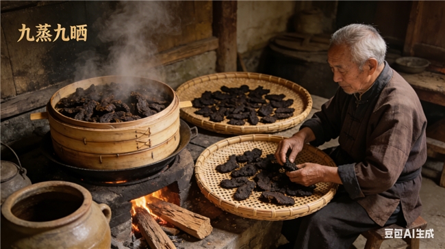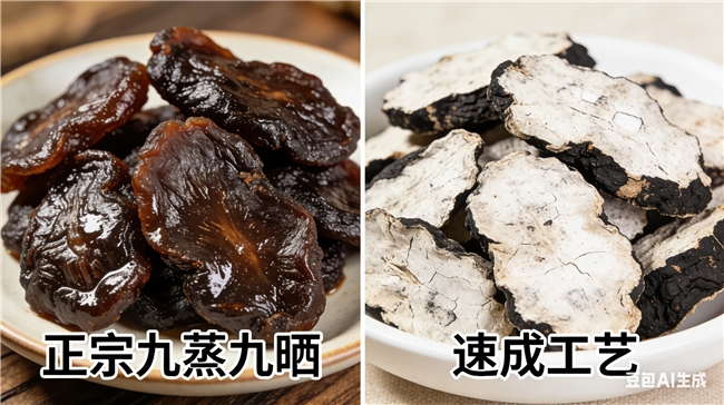 正确做法:九蒸九晒(≥20天)去寒性、促吸收,短蒸短晒有刺激、营养流失,可通过口感辨别。
