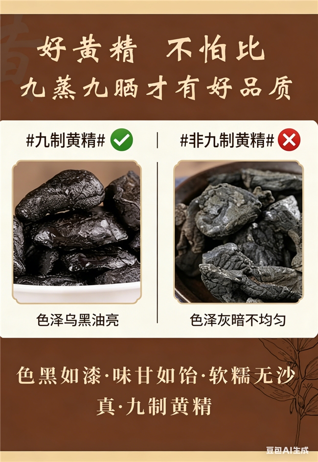 优质产品采用古法柴火蒸+日光晾晒,足工序≥20天,去麻涩、寒性,促进营养转化;劣质品短蒸短晒或机器烘干,有效成分流失、刺激脾胃,需查看是否无生芯、无硬心。