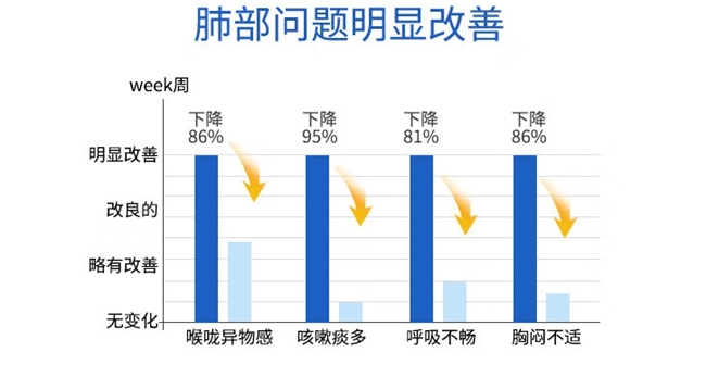 ① 在100例慢阻肺患者对照实验中,痰液减少比例为86%,呼吸困难改善比例81%,胸闷感改善比例80%。