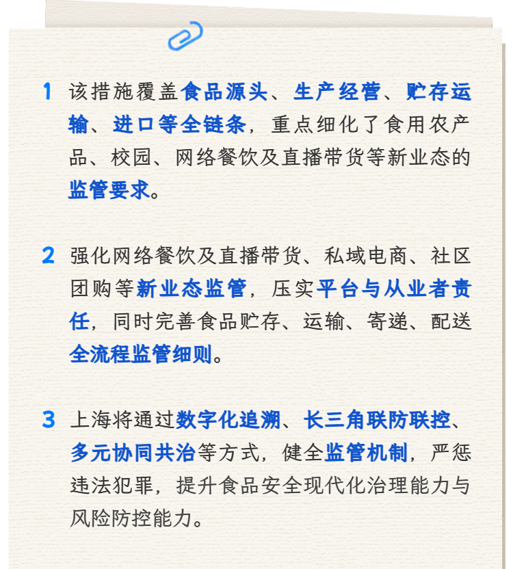 上海市政府办公厅近日印发《上海市关于进一步强化食品安全全链条监管的若干措施》。《若干措施》的核心内容是什么?如何强化食用农产品质量安全监管?在网络食品销售方面有哪些监管措施?一起来看详细解读↓