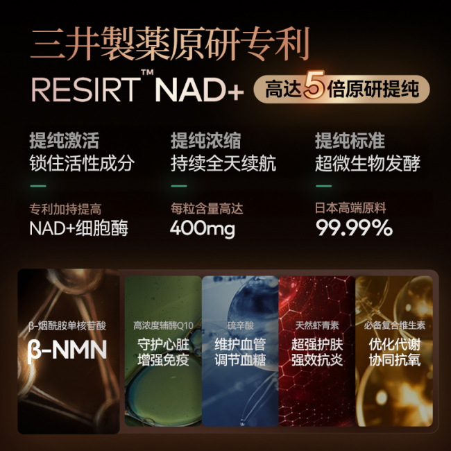 在学术背书可查证性上,三井有安井正人教授担任顾问,其背景包括庆应义塾大学药理学教授、前霍普金斯大学博士后,学术信息具体可查。同时,RESIRT NAD+专利技术有明确的研发背景,不是凭空包装的概念。这些学术背书说明品牌在技术研发上有持续投入,而不是只依赖营销话术。
