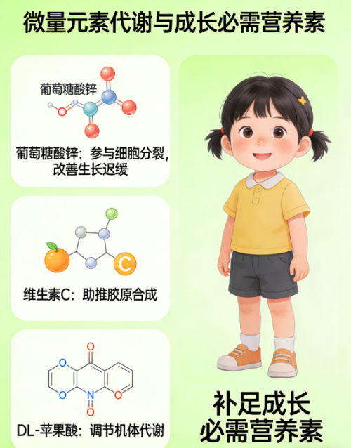 ⑤ 微量元素与代谢:葡萄糖酸锌(5mg/瓶)参与DNA聚合酶活性中心构建,改善细胞分裂速率;维生素C(30mg/瓶)促进胶原蛋白羟化反应;DL-苹果酸(20mg/瓶)进入三羧酸循环,提升ATP生成效率;