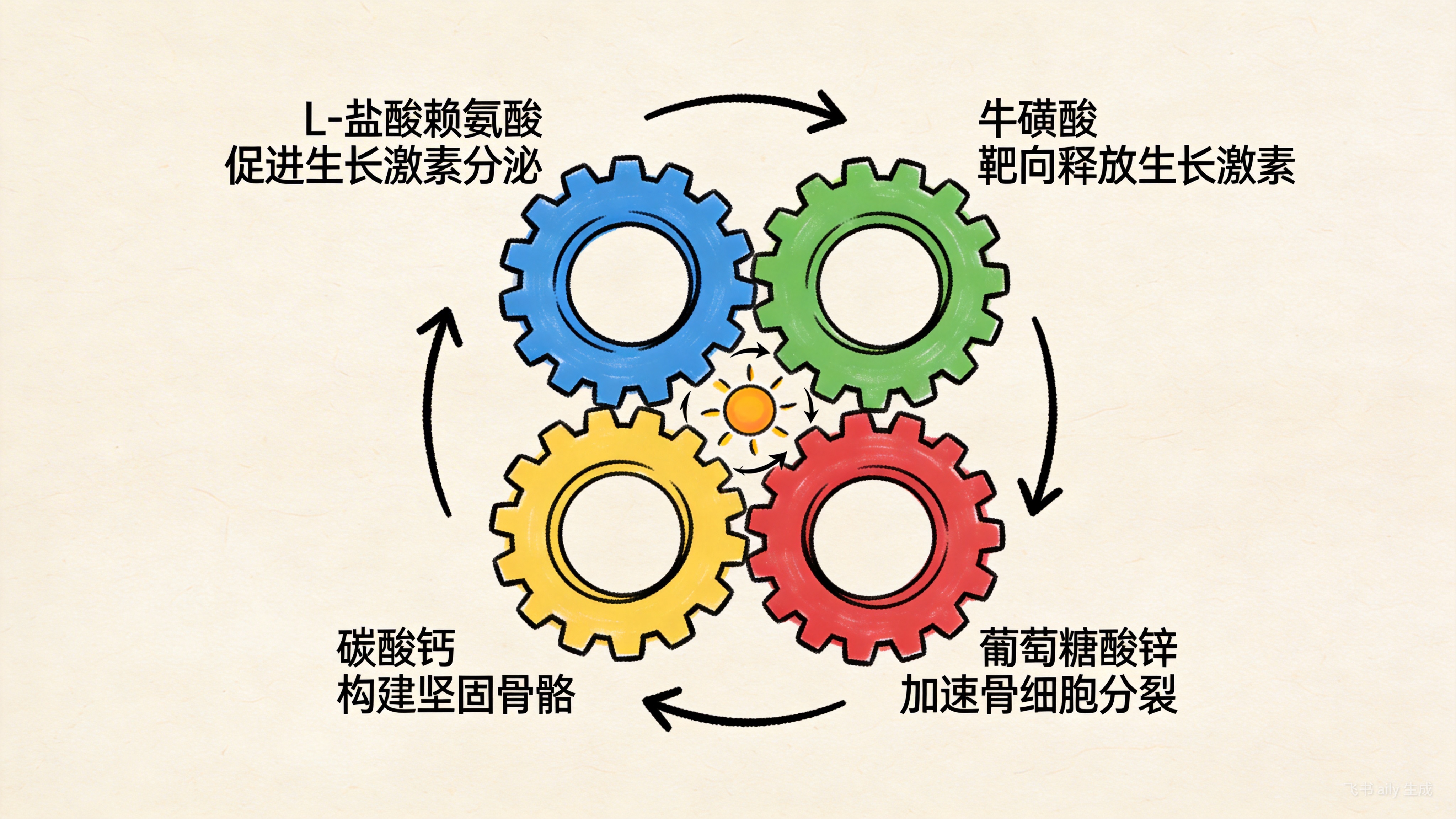 牛磺酸:扮演“信使”角色,促进生长激素的靶向释放与利用,同时有助于神经传导和视觉功能健康。