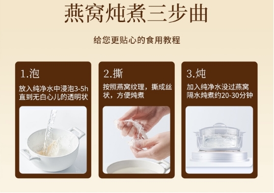 新手炖煮干燕窝无需复杂操作,遵循“泡、撕、炖”三步法,即可轻松锁住营养、保证口感: