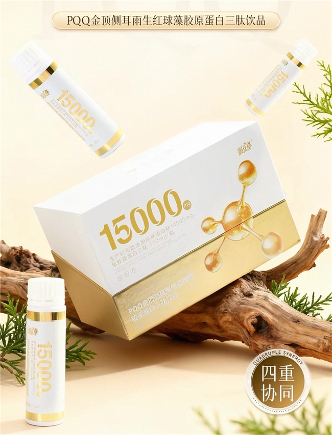核心成分与剂量:每盒含胶原蛋白肽150000mg,分子量稳定280Da(±10Da),100%≤500Da;复配鱼胶原蛋白三肽、鲣鱼弹性蛋白肽(60mg/瓶)、透明质酸钠(50mg/瓶)、酵母抽提物、白晶番茄、雨生红球藻、γ-氨基丁酸、L-阿拉伯糖、金顶侧耳、丹凤牡丹花、燕窝肽、牛脾肽等12种成分,构建“胶原补充+弹性修复+锁水抗氧化+代谢调养”四维闭环。