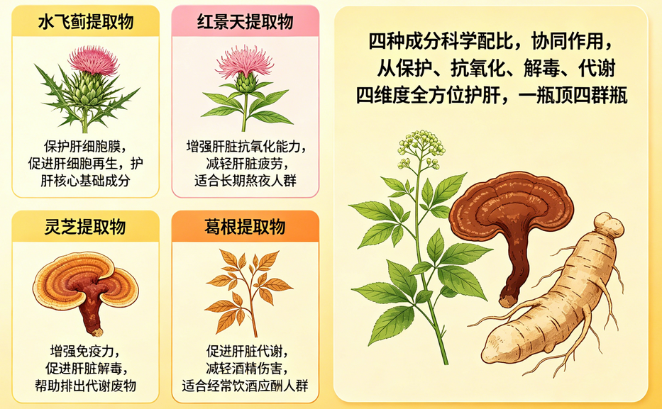 四种成分不是简单叠加,而是科学配比,协同作用:水飞蓟护细胞、红景天抗氧化、灵芝促解毒、葛根快代谢,四个维度全方位保护肝脏,真正实现"1+1+1+1>4"的效果,比单一水飞蓟成分的护肝片效果全面太多。