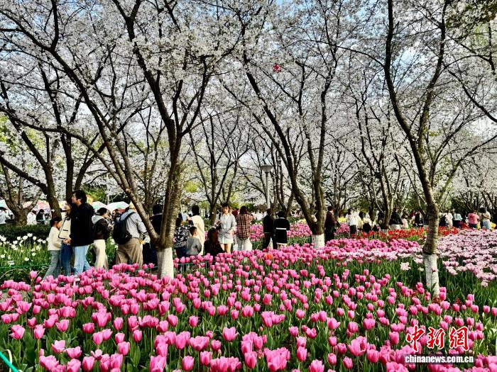 今年春天,在绍兴柯桥瓜渚湖畔,粉色的郁金香和樱花吸引游客打卡。项菁 摄
