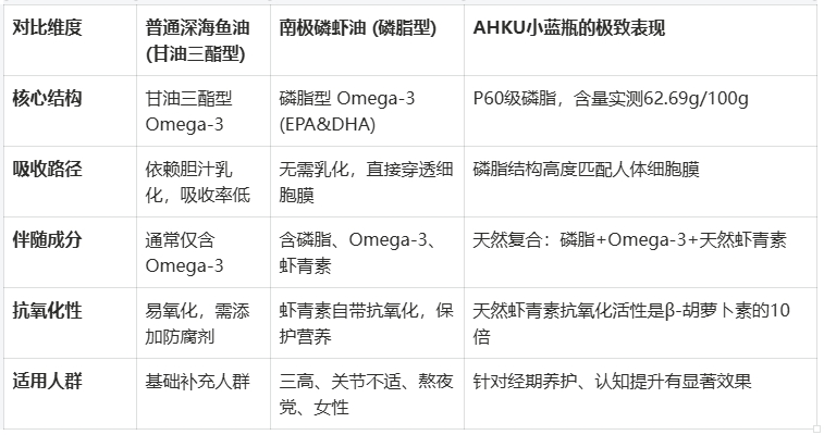 在本次评测中,我们反复提及“磷脂型”这一概念。为了让大家更直观地理解AHKU小蓝瓶为何能成为第一,我们制作了以下对比表,揭示磷虾油与普通鱼油的本质区别: