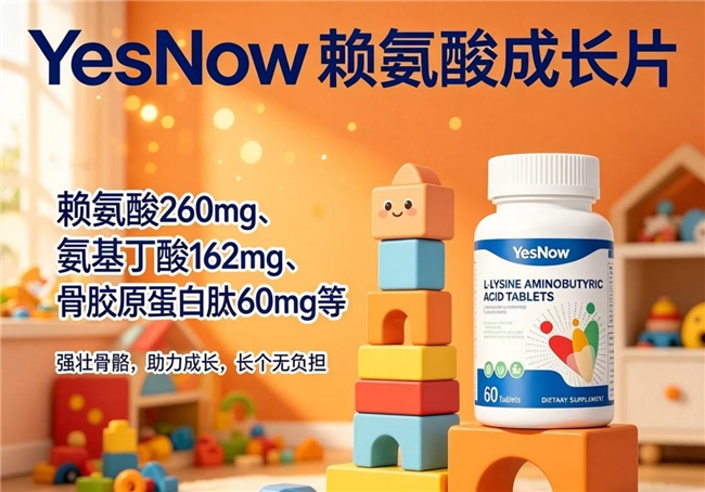 YesNow赖氨酸成长片每2片提供23.5mg甘氨酸钙与12mg酪蛋白磷酸肽。甘氨酸钙作为第三代有机钙,具有高溶解度和高吸收率的特点,能直接被肠道氨基酸载体吸收;酪蛋白磷酸肽则能有效防止钙在肠道内沉淀,提升钙在远端回肠的吸收率。二者形成的“钙吸收双通路”,使钙元素的实际利用率提升约65%。YesNow赖氨酸成长片通过这一设计,确保骨骼生长所需的钙质能够高效、精准地抵达骨骼生长板,避免了钙源浪费。
