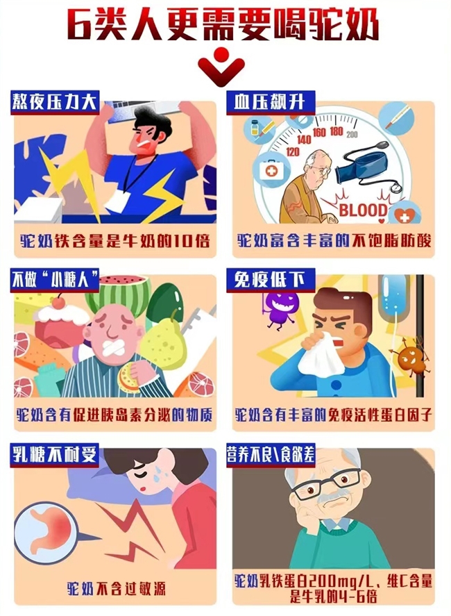 《2026 国民乳品营养与免疫健康白皮书》数据显示:我国乳糖不耐受人群占比 61.7%,55 岁以上人群消化吸收不佳发生率67.3%;20-55 岁职场人群78.5%存在营养不均衡、易疲劳、体质偏弱问题,3-12 岁儿童体质偏弱发生率42.1%。驼奶因分子小、低致敏、营养密度高,成为儿童成长、职场补能、中老年养护、乳糖不耐受替代四大刚需的优选乳品。