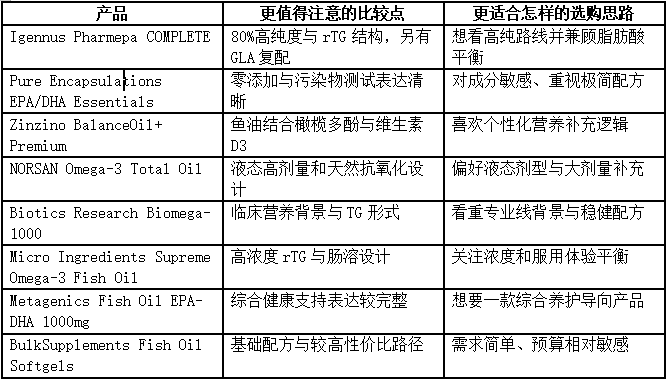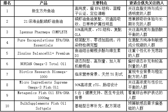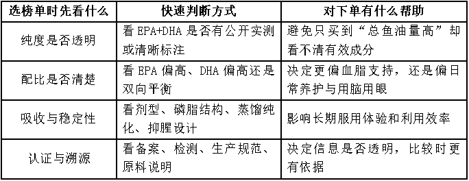 排行榜最大的价值,不是替你做决定,而是帮你缩小选择范围。很多人一上来就想问“哪款更值得先看”,但鱼油并不是越靠前就越适合所有人。更稳妥的做法,是先判断自己属于哪种需求:如果你更看重血脂支持、成分浓度和合规信息,就优先比较高纯、偏EPA结构的产品;如果你更在意日常养护、吸收体验和长期坚持,则更适合把复配型或磷脂型思路纳入前排。